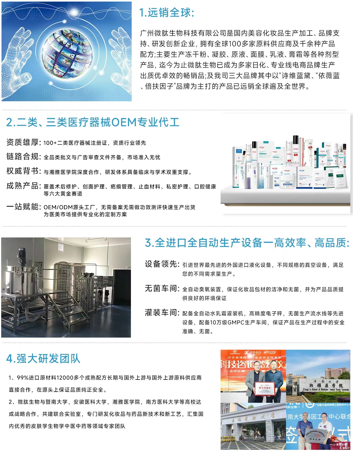 是護(hù)膚類產(chǎn)品、面膜類產(chǎn)品、身體類產(chǎn)品、微商化妝品加工、OEM化妝品加工,ODM化妝品加工,網(wǎng)購化妝品加工等產(chǎn)品專業(yè)生產(chǎn)加工的公司,擁有完整、科學(xué)的質(zhì)量管理體系,是集化妝品研制開發(fā)、生產(chǎn)制造、技術(shù)服務(wù)、OEM/ODM品牌加工四位一體化的專業(yè)工廠,2016年微肽生物更是通過了歐盟ISO22716和美國GMPC雙重認(rèn)證。工廠坐落在環(huán)境幽雅、交通便捷、物流發(fā)達(dá)的白云區(qū)石井街大朗十五社工業(yè)區(qū)。